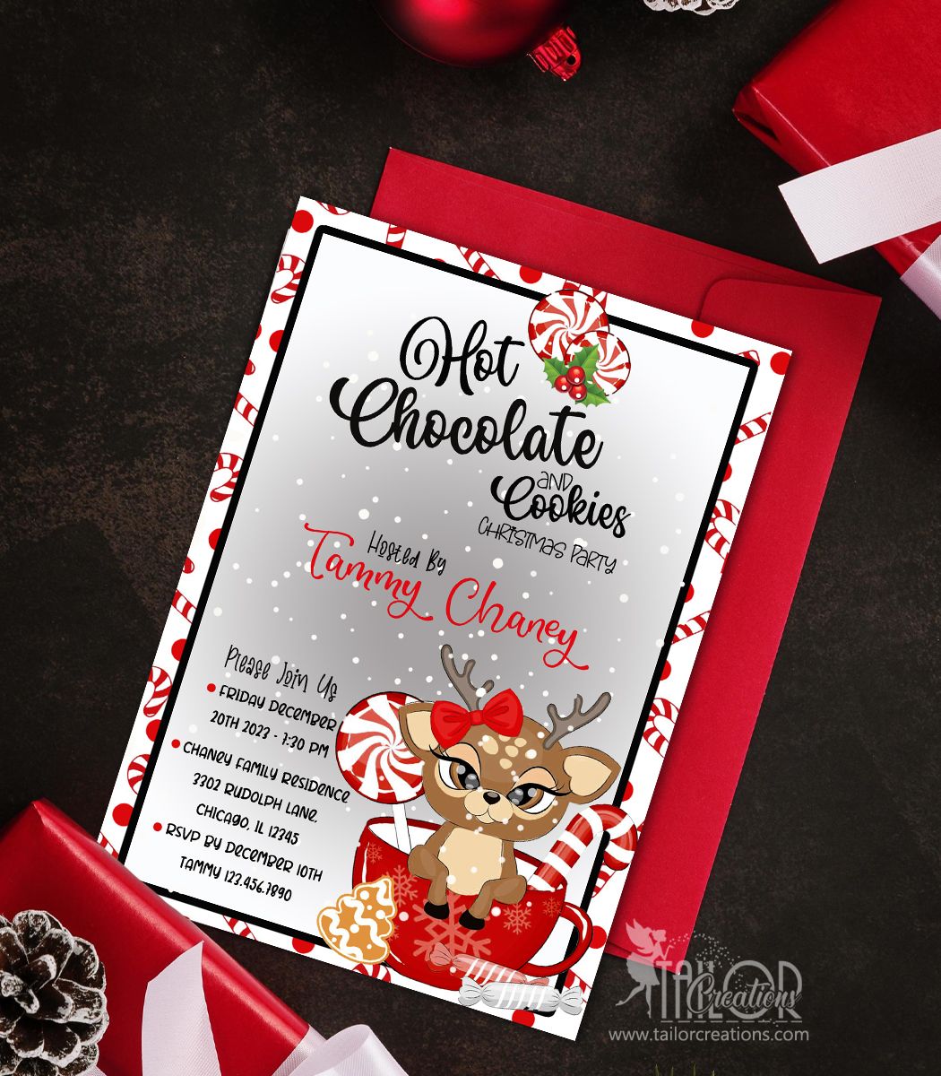 Plan the perfect Christmas party from beginning to end with our custom Peppermint Hot Cocoa Reindeer Christmas Invitations. Designed to capture the warmth and charm of the holiday season, these invitations are ideal for festive gatherings, hot chocolate bar parties, classroom events, and cozy winter celebrations.
