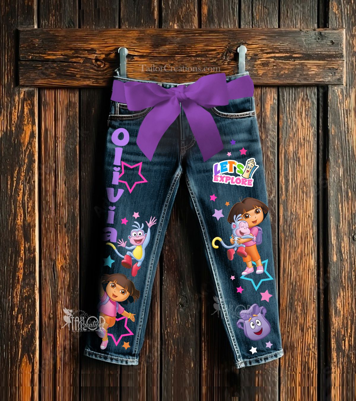 🩷 Your little explorer will be ready for adventure in this adorable Dora the Explorer themed birthday outfit! This custom denim set includes a personalized puff-sleeve top with your choice of wording and Dora-inspired decal design. Paired with boutique-style denim shorts, overalls, or jeans, beautifully embellished with vibrant Dora the Explorer graphics. A ribbon belt and matching accessory complete the adventurous look.