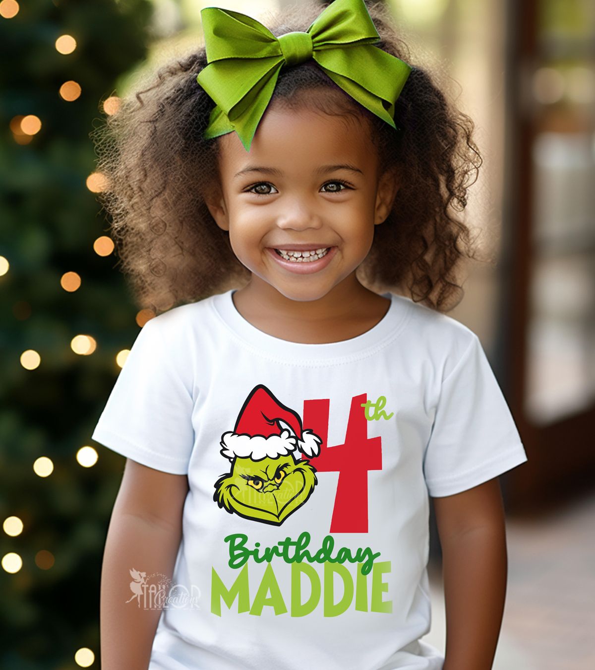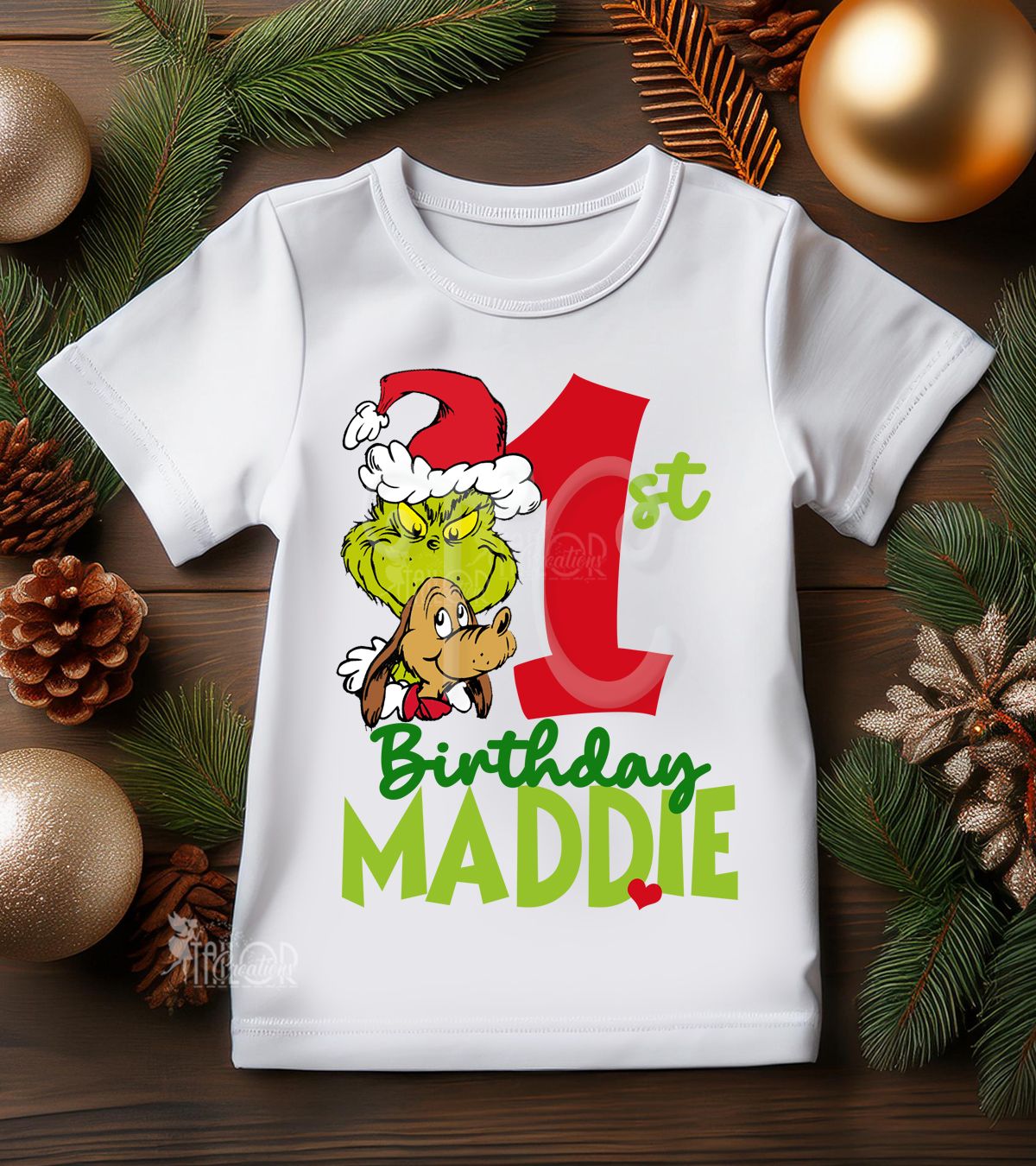 Perfect for a Grinch-themed birthday party, first birthday cake smash photoshoot, half birthday, special school event, or as a thoughtful Grinch birthday gift. This festive and playful tee is designed to make your child’s celebration extra special. Personalized with your child’s name, age, or any wording of your choice—adding a wonderfully whimsical and heartfelt touch to their big day.