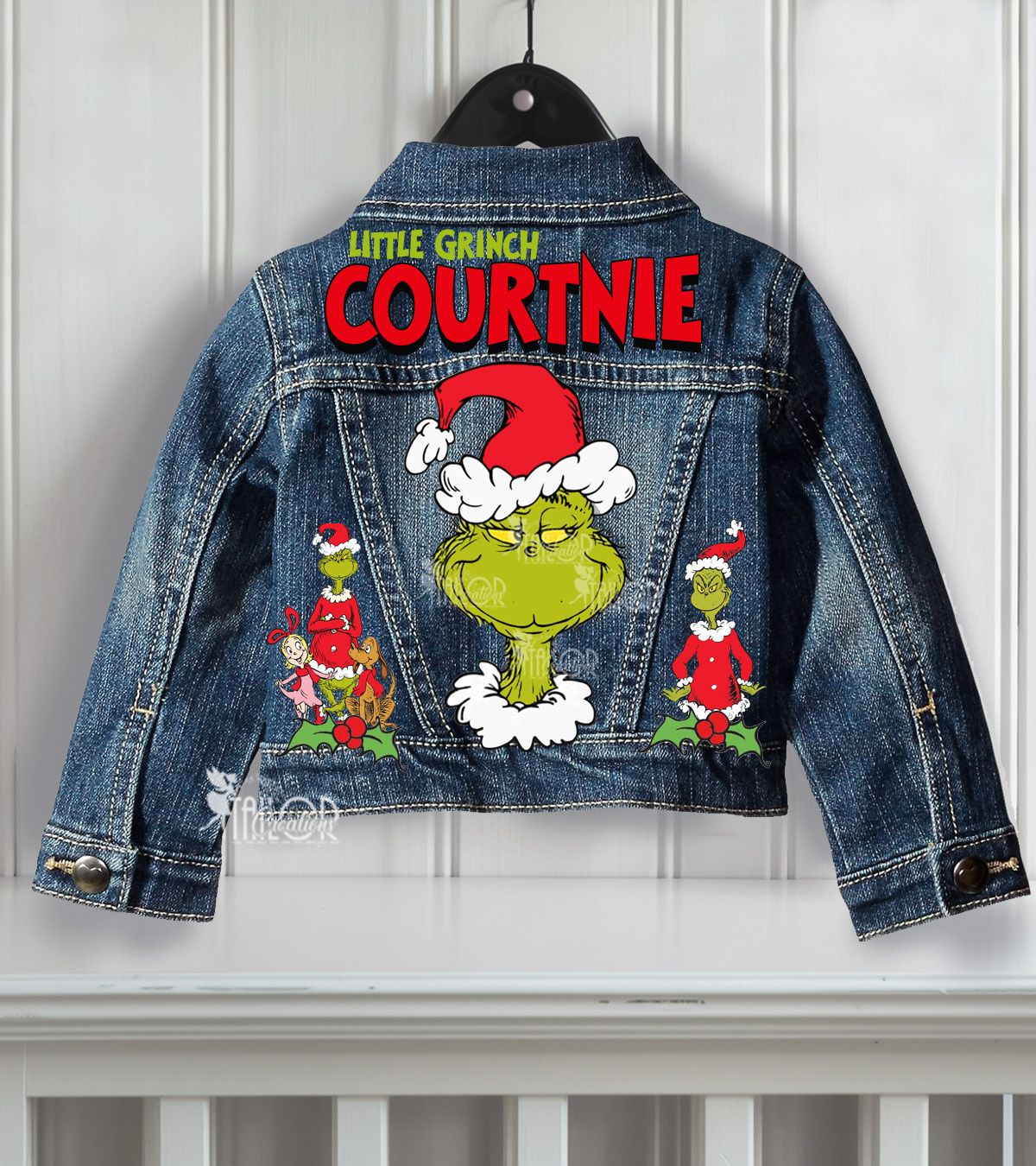 Complete the look with our Custom Grinch Birthday Outfits and denim jackets, each sold separately. The perfect finishing touch for a day filled with fun, laughter, and Grinchy cheer.
