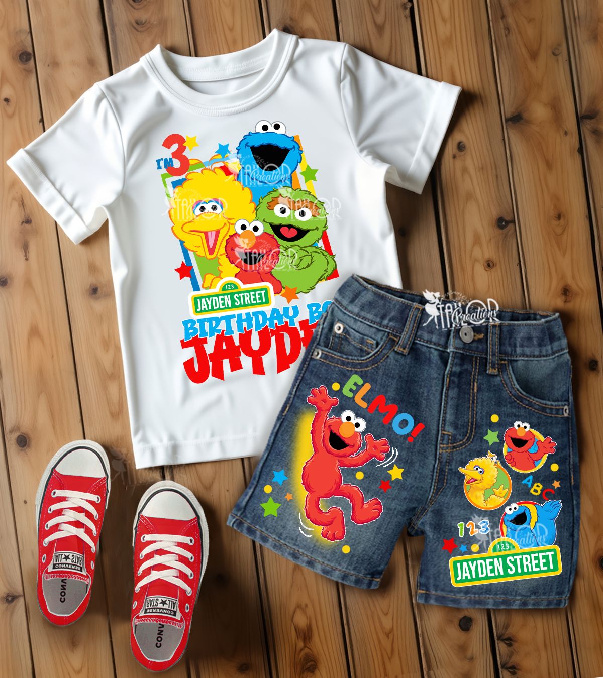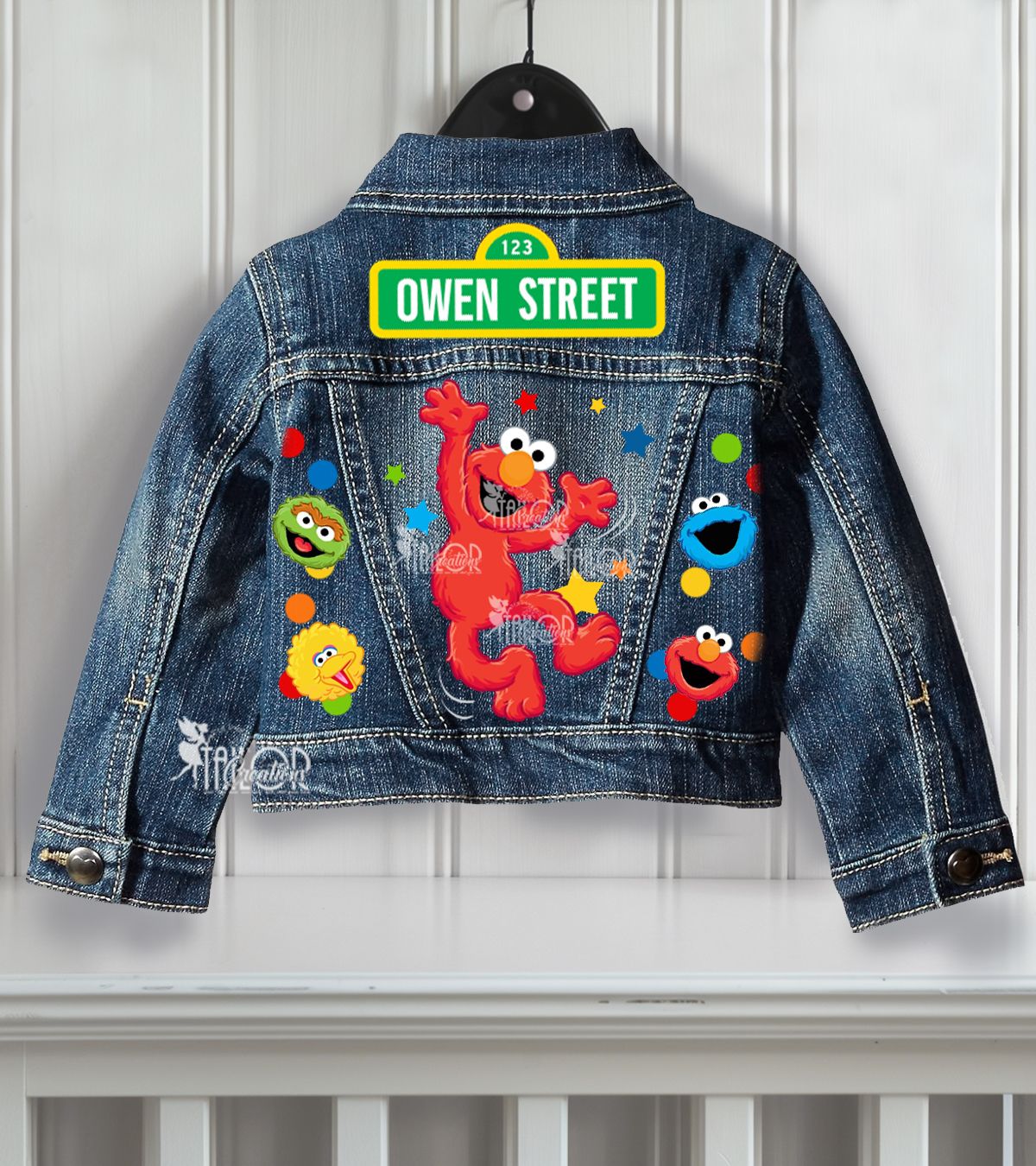 Complete the look with our Custom Elmo Birthday Outfits and Denim Jackets, sold separately.