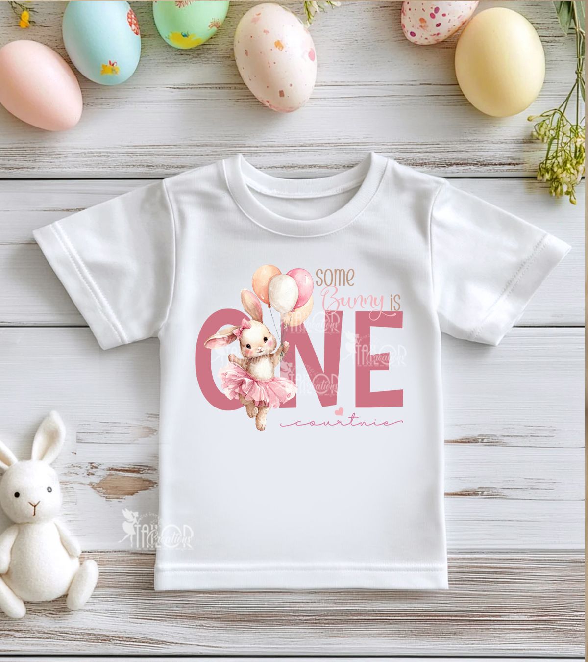 Want to complete the look? This design is also available in coordinating outfit options for newborns through youth sizes. Create unforgettable birthday memories with this charming pastel bunny tee!