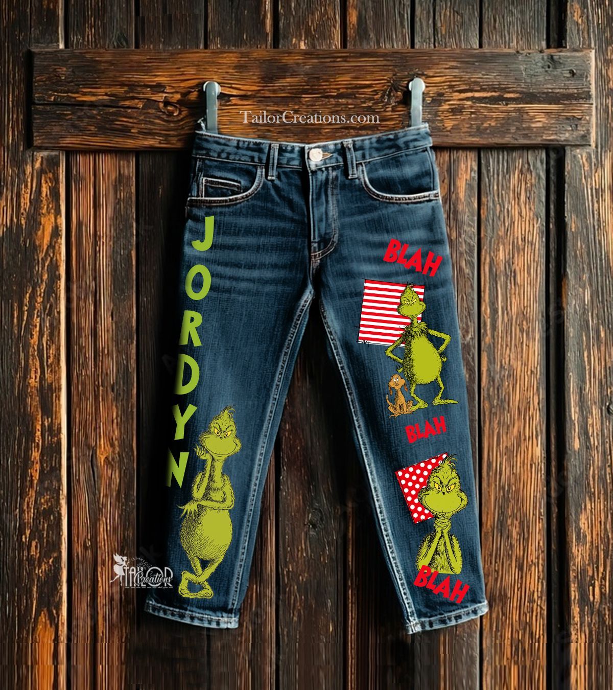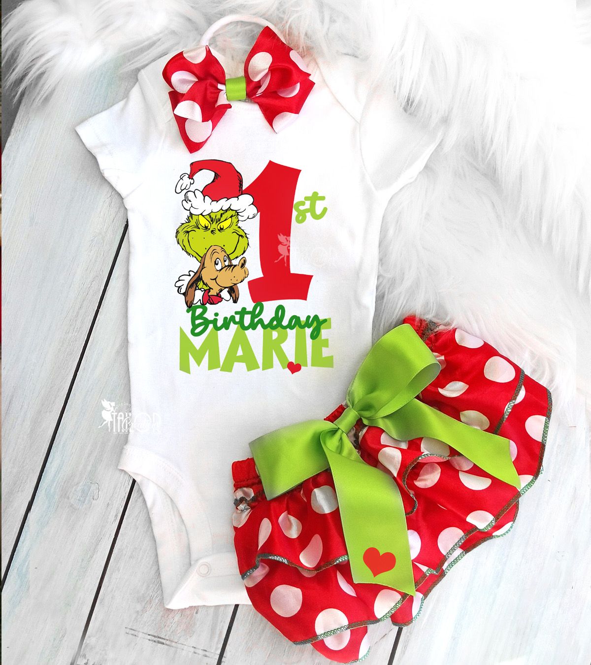 Custom Grinch birthday outfits and festive accessories like denim jackets are also available and sold separately.