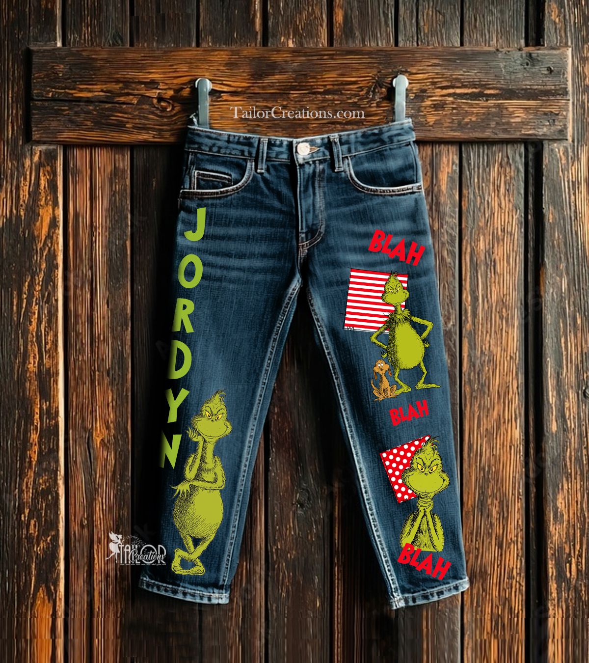 Complete the look with anyone of our Custom Grinch matching outfits, custom denim jeans or shirts, all are available separately.