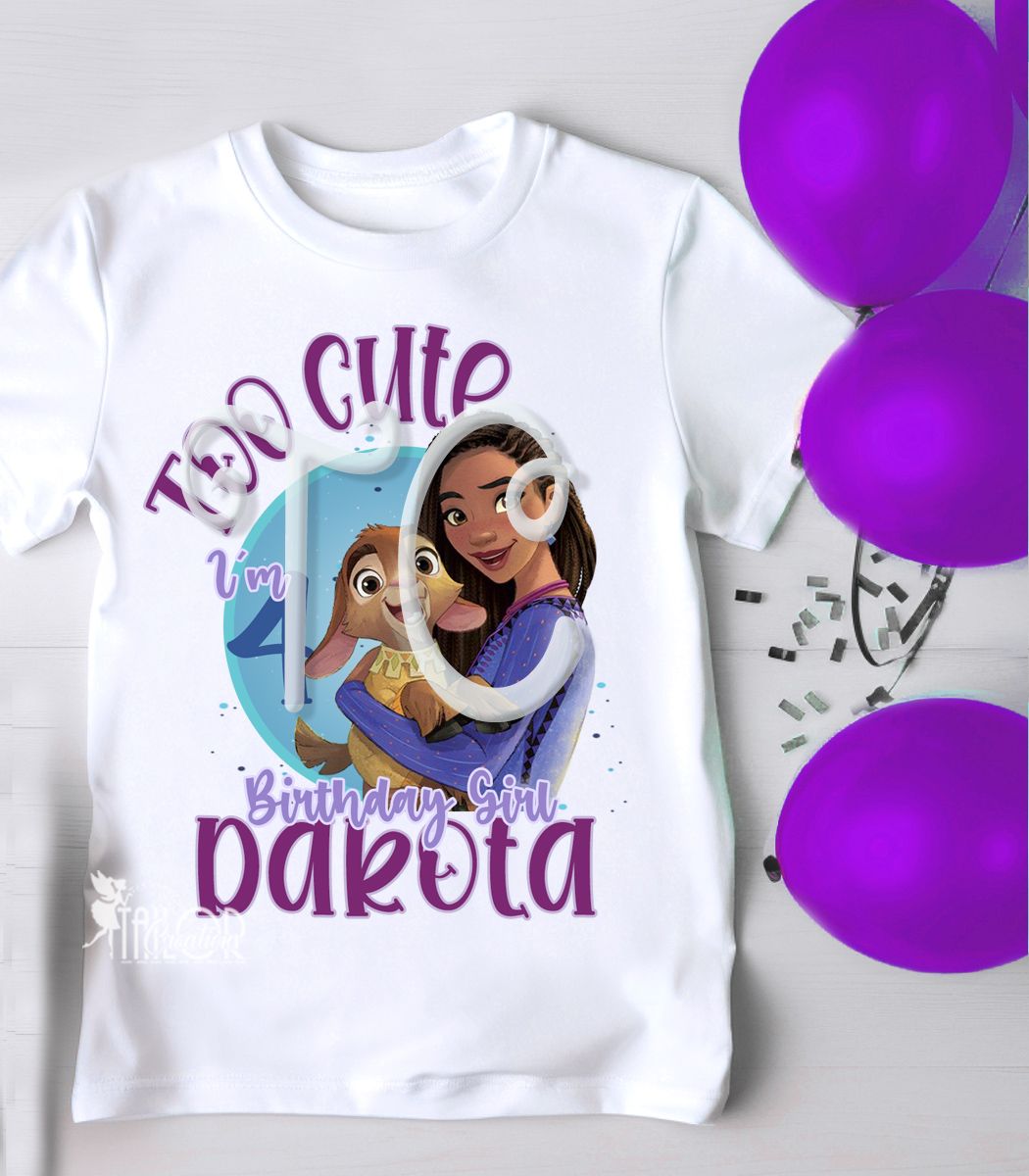 Add a sweet and magical touch to your little ones big day with this adorable Disney Wish Asha personalized Birthday Tee Shirt. Ideal for a Disney Wish themed birthday party, cake smash photoshoot, half birthday, special Disney family trip to Disneyland or DIsney World or as a unique Wish Asha and Valentino birthday gift. Customized with your child’s name, age, or any wording of your choice. this Asha shirt adds a personal magical touch to the celebration.