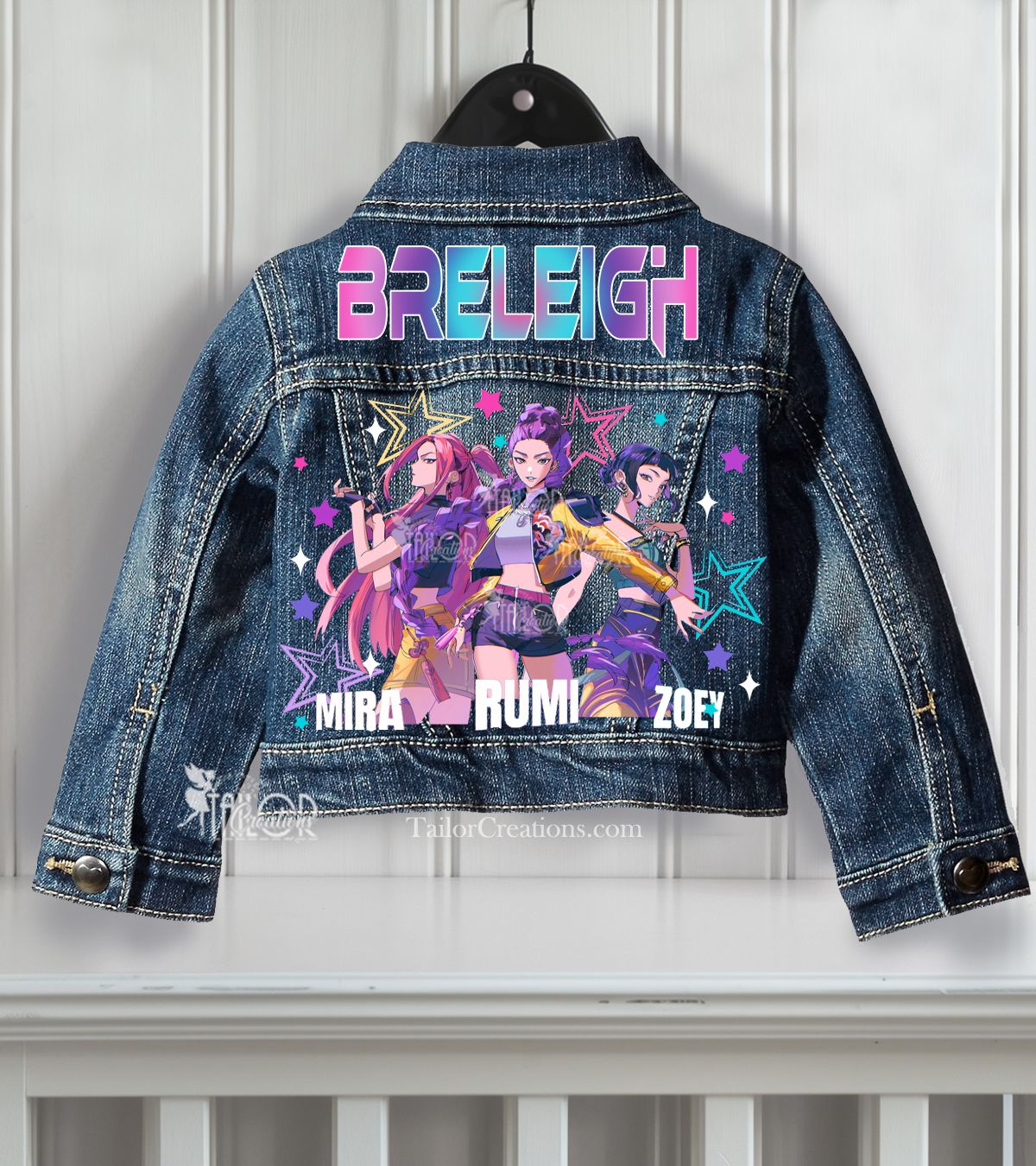 🩷 Step into the spotlight with these exclusive custom denim jeans inspired by the Huntrix K-Pop Demon Hunters. Designed for fans of the fierce trio Mira, Rumi, and Zoey. Your choice of jeans or overalls. Each pair is uniquely designed and beautifully embellished with vibrant K-Pop Demon Hunter theme graphics, front and back, adding extra flair.