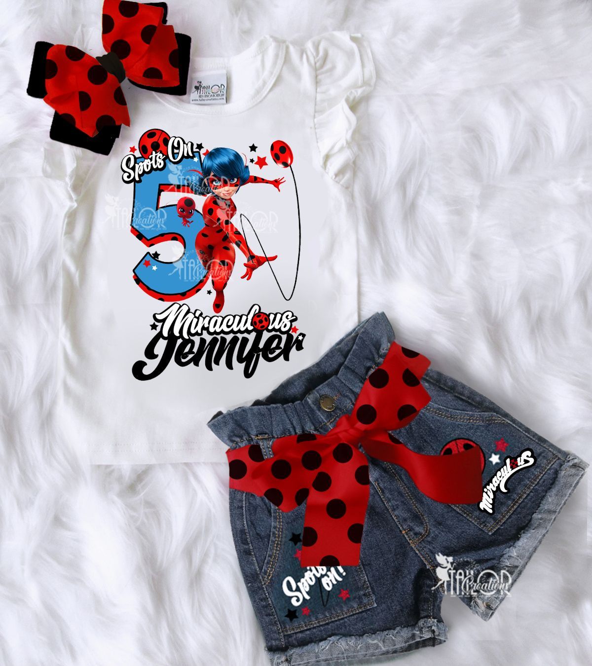 🩷 Spots On! Step into the magical, action-packed world of Miraculous Ladybug with these exclusive custom denim jeans pants inspired by the beloved superhero duo, Ladybug and Cat Noir. Designed for fans of the courageous and quick-thinking heroes. Choose from your choice of jeans or overalls. Your selection is uniquely designed and beautifully embellished with vibrant Miraculous Ladybug themed graphics, front and back, complete with your child's name and age or any wording of your choice for that extra personalized flair.