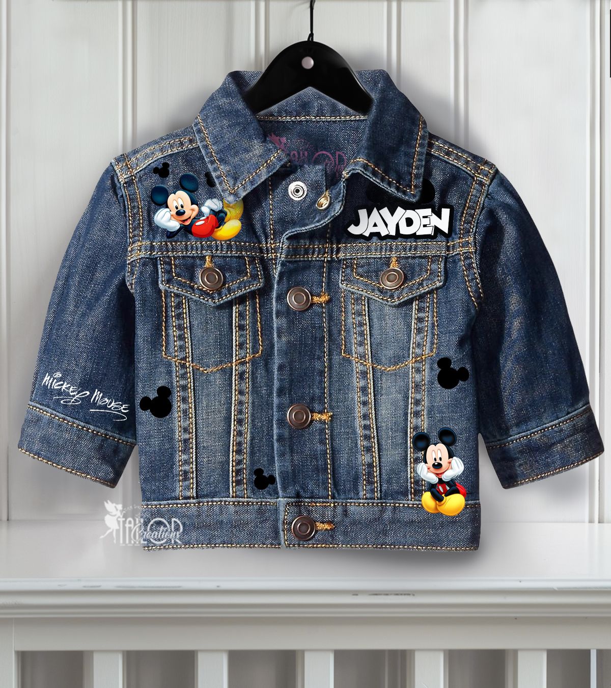 Complete the look, these jeans are also sold as a complete set in our store. Custom Mickey Mouse denim jacket, shirts, and other accessories.