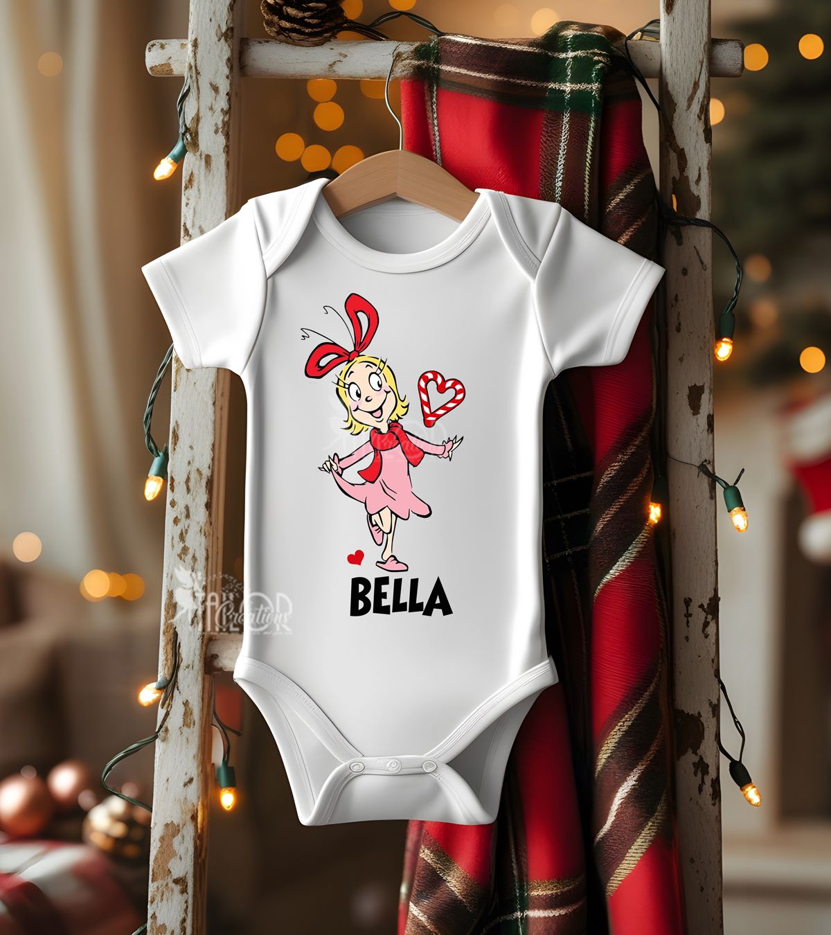 This personalized Cindy Lou set features your choice of a a puff sleeve top or onesie in soft holiday tones in blush pink and cranberry reds, custom printed with your child’s name or message. Pair it with our delicate lace ruffle shorts or bloomers with added bow details, layered with high-quality lace front to back for extra cuteness and cozy comfort. The outfit is finished with a red bow hair bow accessory, perfect for capturing that signature Cindy Lou Who sweetness.