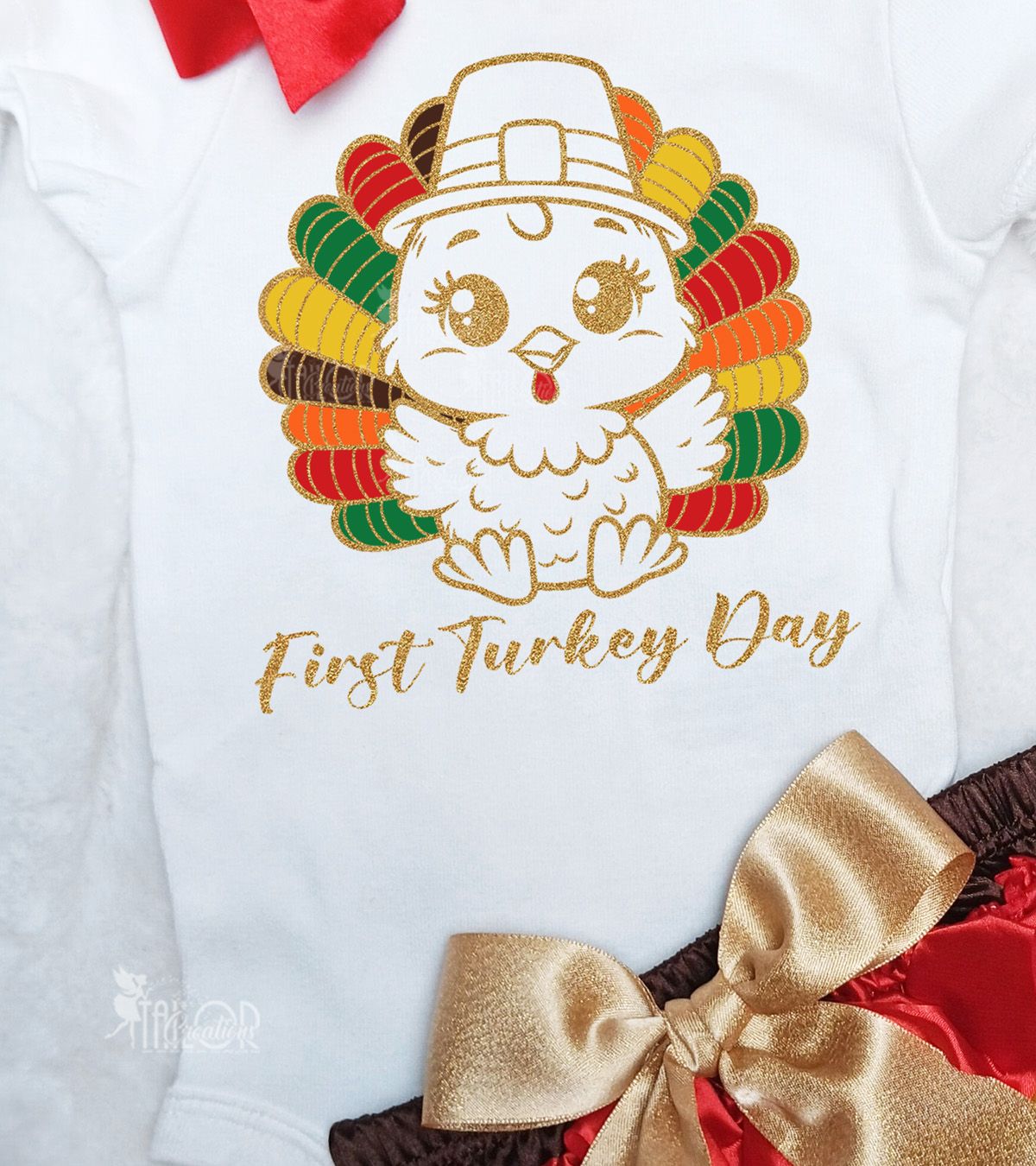 This personalized Thanksgiving baby girl set features your choice of a soft cotton bodysuit/onesie, custom printed with your child’s name or special message and a shimmering gold glitter Turkey, to add that extra sparkle. It pairs beautifully with our satin ruffle turkey-inspired bloomers, featuring fall tones and a matching hair bow to complete the festive look.