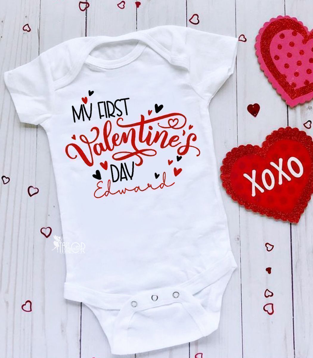 My First Valentines Day Boys Toddler Baby Bodysuit Onesie Custom T Shirt Heart Suspenders Bowtie Cupid Cake Smashing Set