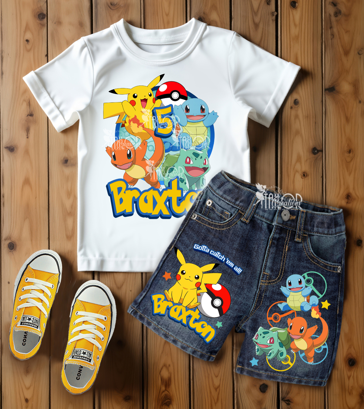 Pokemon Custom Denim Birthday Outfit for Boys - Pokemon Birthday Party Tee Shirt Shorts Set
