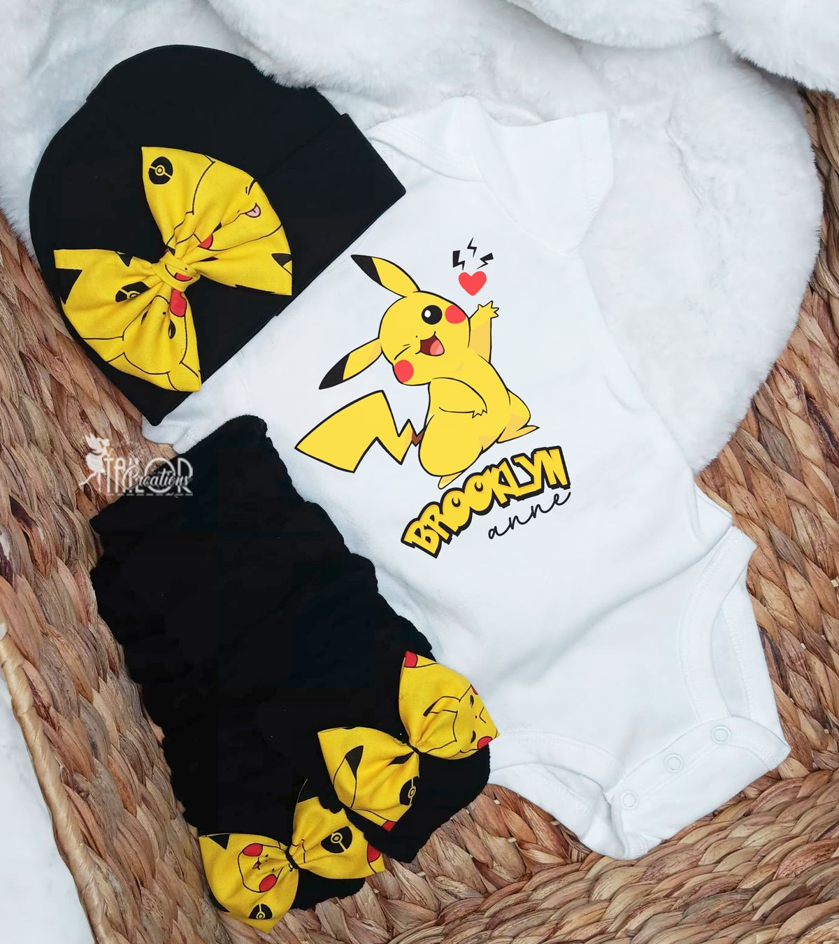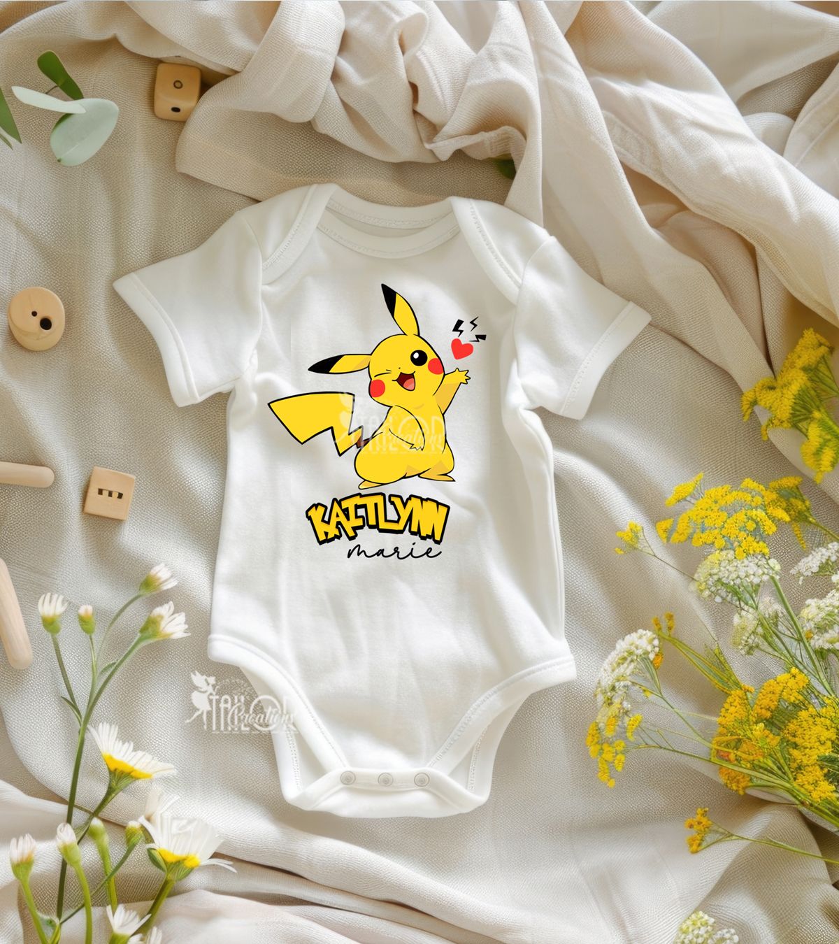 Personalize the onesie with your choice of Pokemon inspired decals and custom wording. Whether it's her name, a fun phrase like “Mommy’s Little Pikachu,” or your own unique message. Complete the look with matching outfit options to create a picture-perfect baby ensemble any fan would adore.