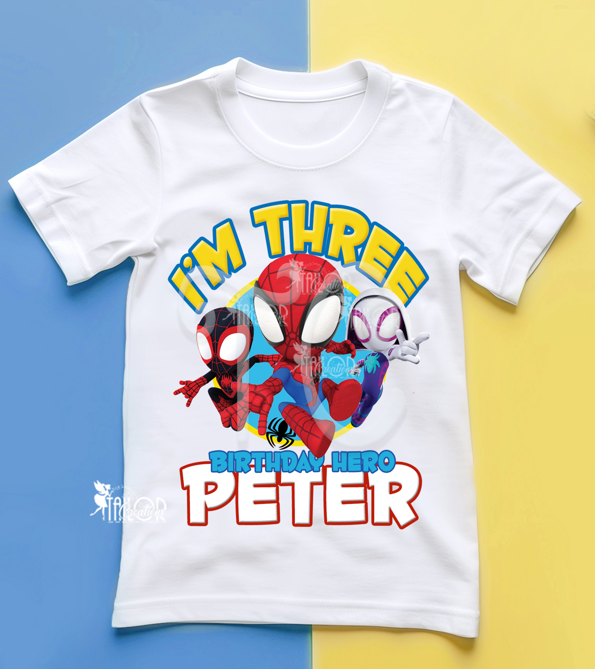 This fun, colorful, and stylish superhero outfit features a personalized short sleeve top inspired by your child’s favorite crime-fighting trio, Spidey, Spin, and Ghost-Spider. Customize the shirt with your choice of design and wording to make it extra special for their big day.