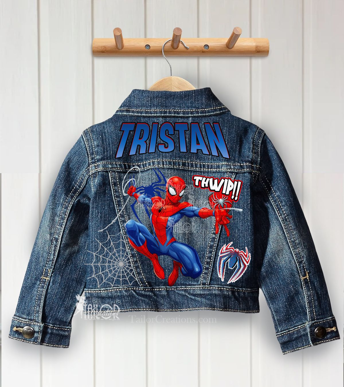 ⭐ Swing into style and add superhero flair to your childs wardrobe with our Custom Personalized Spider-Man Jean Jacket! Perfect for toddlers, babies, and kids who love the Marvel universe, this custom denim jacket features our unique Spider-Man design and brings their favorite web-slinger to life in a bold and stylish way.