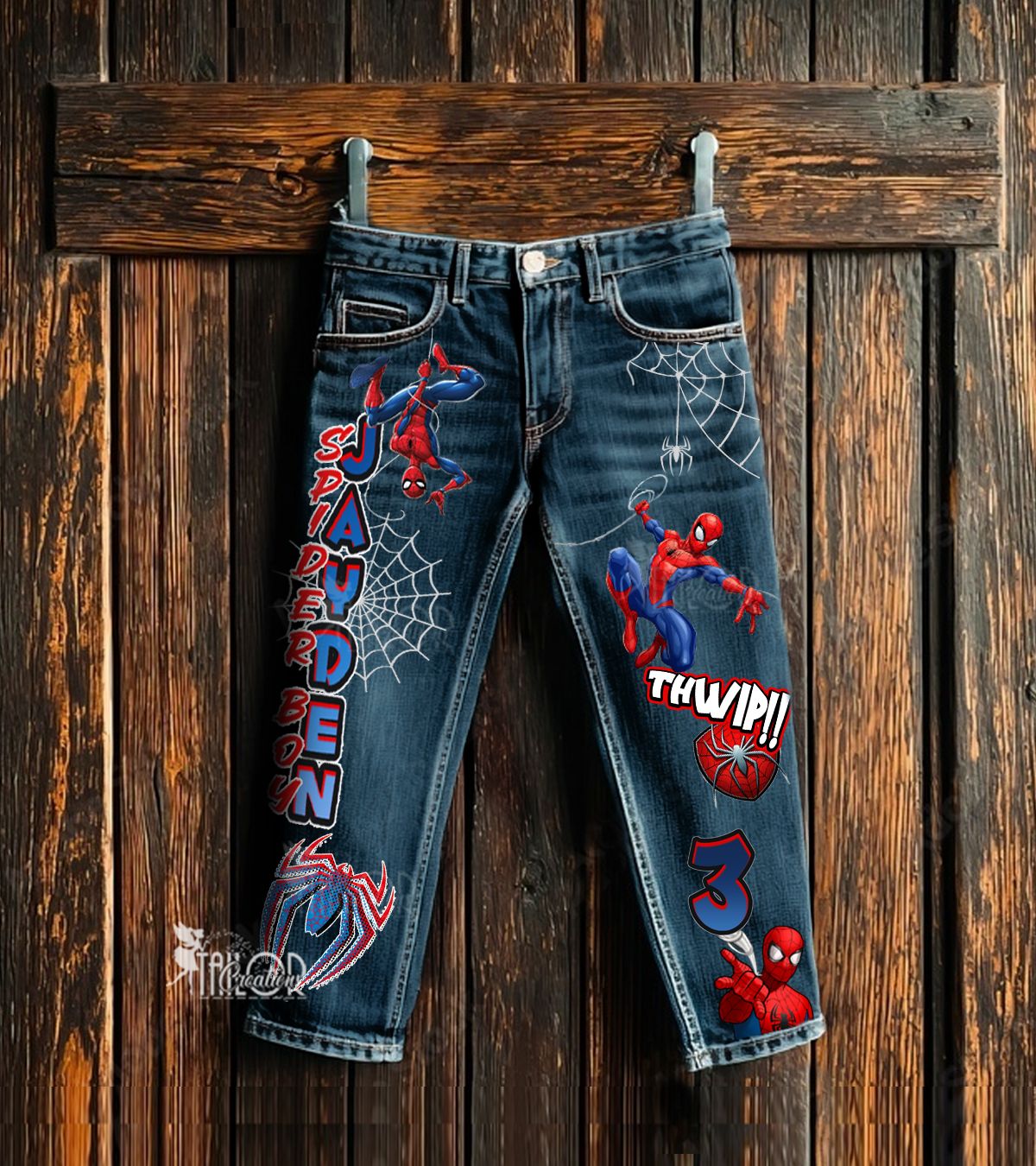 Complete the look with our custom Spider-Man outfits, paired with your choice of denim shorts, jeans, or overalls. Personalized Spider-Man denim jackets are also available. All sold separately.