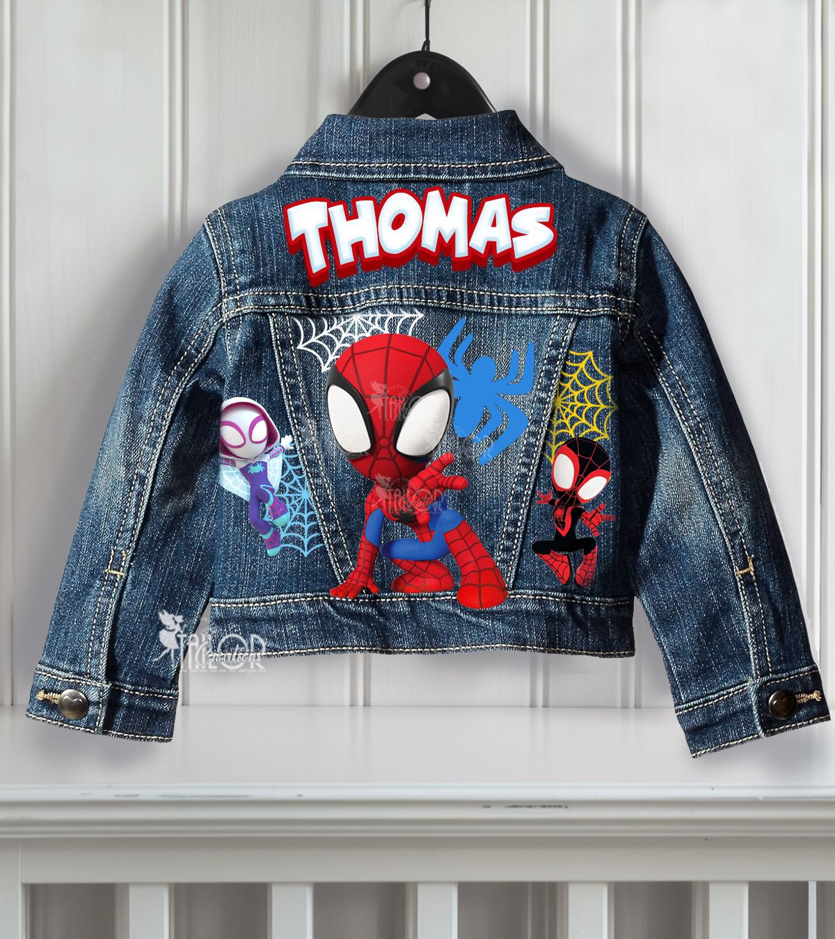 Complete the look with our custom Spidey outfits, paired with your choice of denim shorts, jeans, or overalls. Personalized Spidey denim jackets are also available. All sold separately.