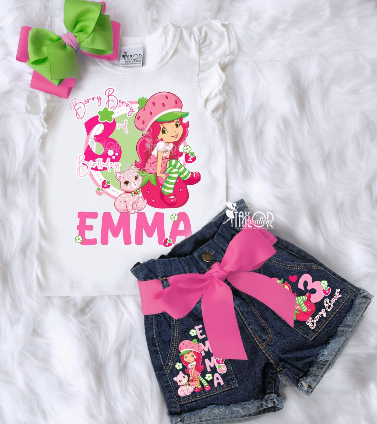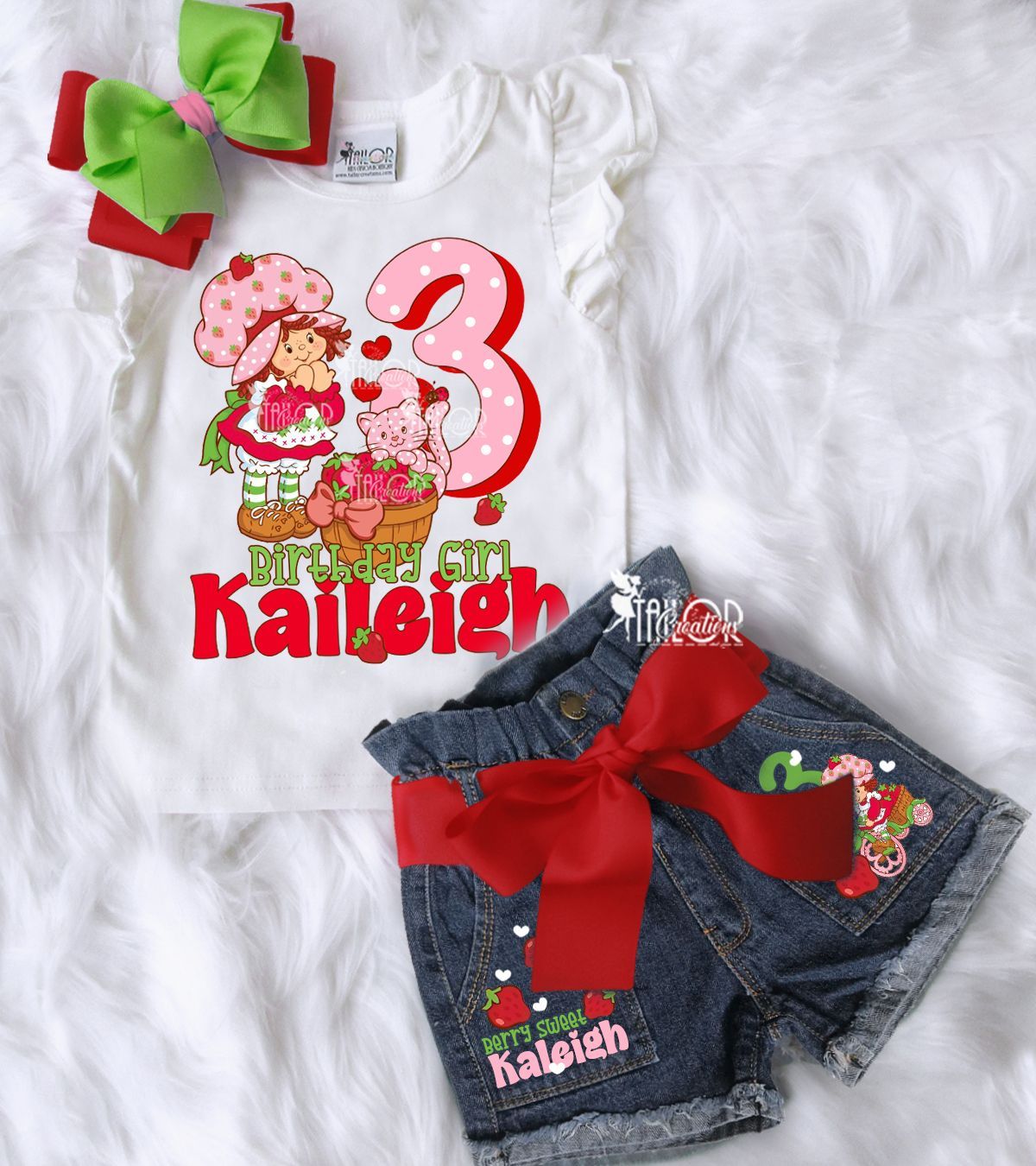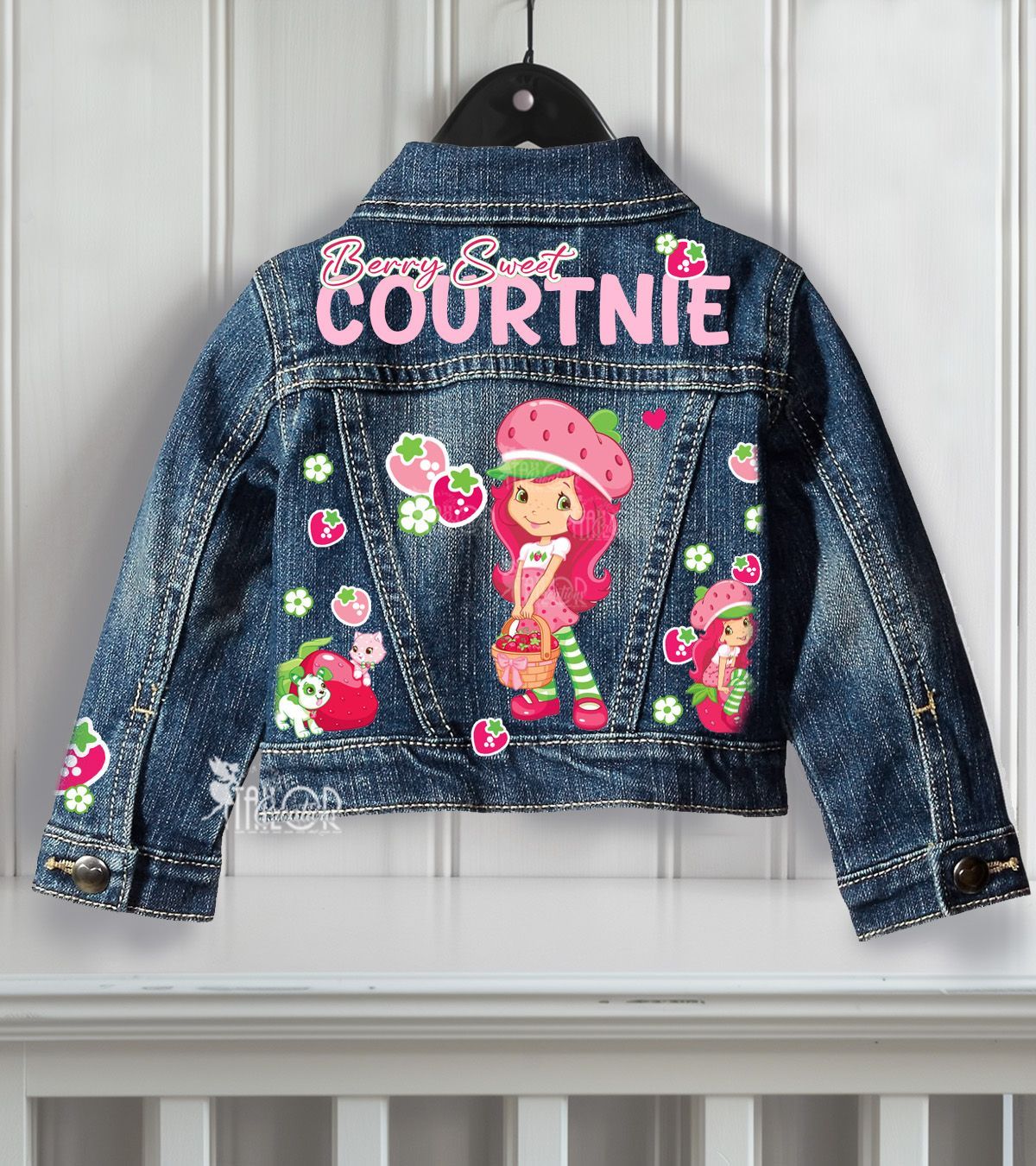 🩷 Your little sweetheart will be handpicked for perfection in this adorable Strawberry Shortcake theme custom denim jeans!