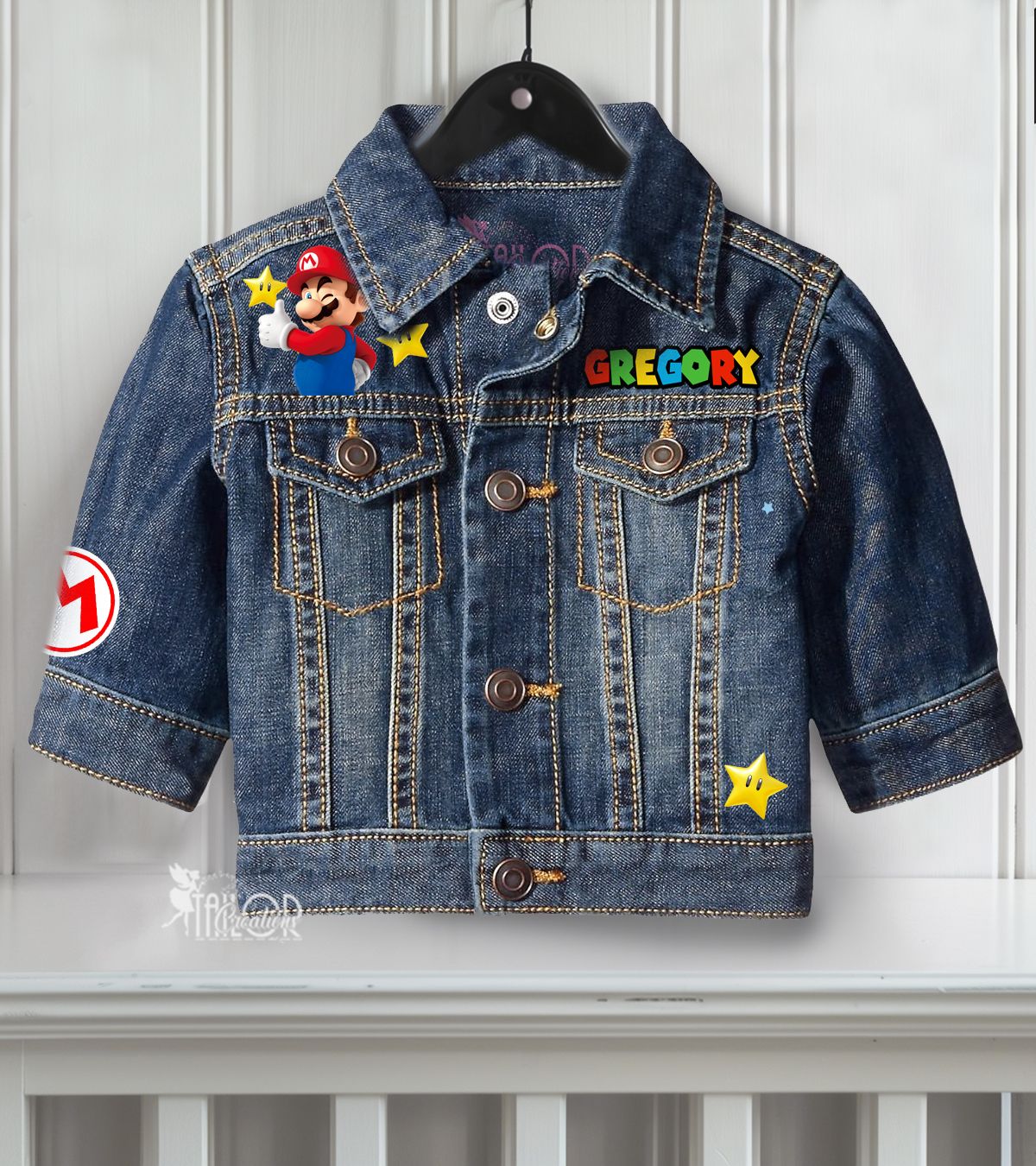 Super Mario Denim Jean Jacket Kids - Super Mario Birthday Outfit - Custom Denim Jacket Kid