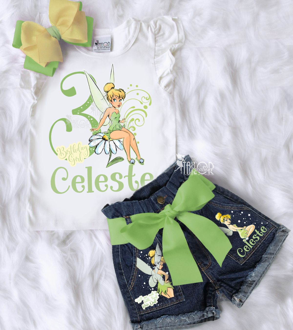 Paired with boutique-style denim shorts, overalls, or jeans, beautifully embellished with vibrant Tinker Bell graphics and sparkling accents, this outfit is designed to make her shine on her special day. A coordinating ribbon belt and matching accessory complete the magical ensemble.