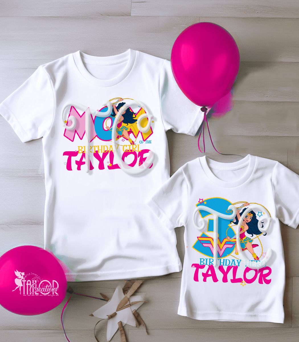 We offer a wide selection of Wonder Woman Theme Custom Birthday Products, including matching shirts for kids and adults, party favors, stickers, and more—all designed to elevate your celebration. Our custom products will ensure your event is unforgettable, creating memories that everyone will cherish for years to come!