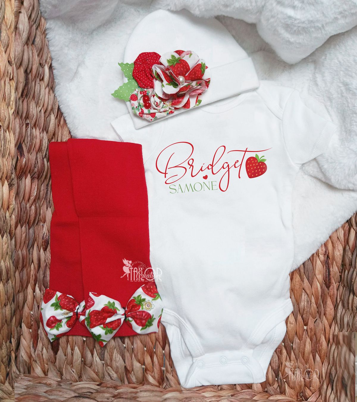 Add a berry sweet touch to her early days with our lovely custom Strawberry Baby Girl Outfit Gift Set is the sweetest way to welcome a new little one. Whether you’re announcing her birth, surprising a mom-to-be, creating a keepsake for her first photos, or looking for a precious outfit as sweet as your baby girl.